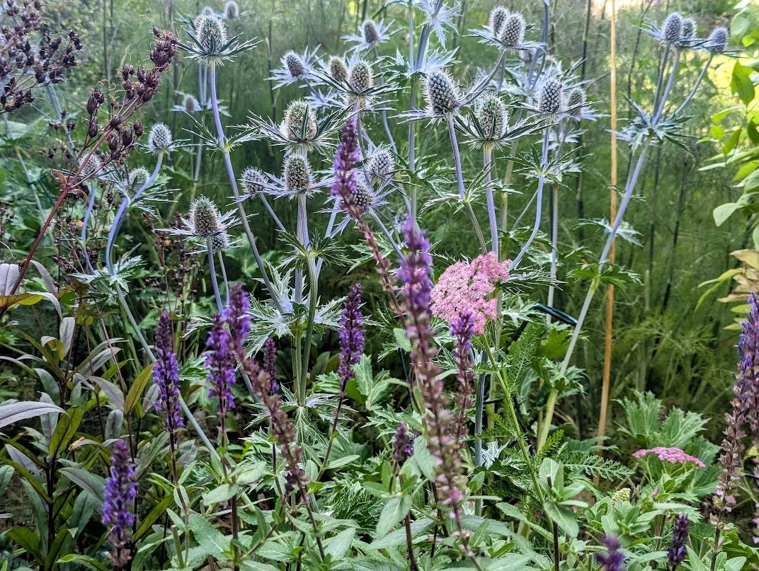 The garage-side, east facing garden is my beautiful, sparkly ‘princess’ garden in June with purple leaf penstemon, fluffy white valerian, spiky purple salvia ‘Caradonna’, yellow miniature ‘Moly’ allium, electric blue sea holly, neon primula candelabra and more. It’s a wild thing, but it makes my heart sing.